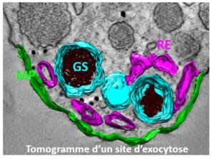 L’objectif de ce projet est de comprendre le rôle des sites de contact entre le réticulum endoplasmique, les granules de sécrétion et la membrane plasmique dans la régulation du cycle d’exocytose et d’endocytose. En particulier, nous étudions la dynamique du calcium à proximité des sites d’exocytose et la contribution des différentes formes d’acide phosphatidique (PA) au cours des différentes étapes de l’exocytose et leur dynamique au sein de ces sites de contact entre organelles.